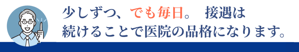 毎日少しずつ積み上げ、成功を共有し、目的を語り続ければ、気づいたときには医院文化として根づいています。接遇は努力ではなく、習慣で強くなるのです。