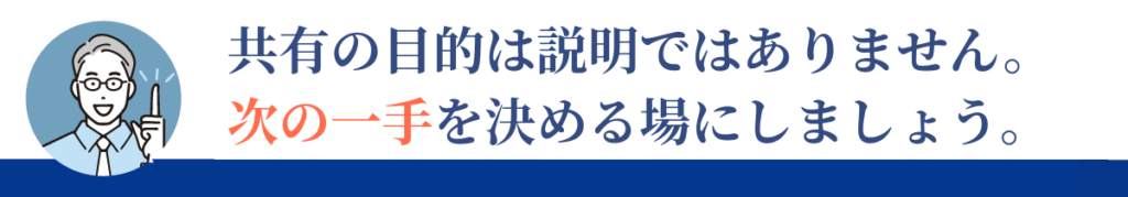この四点が決まらなければ、共有は成果につながりません。大きな改革は不要です。一つの小さな行動を決めることで、改善は動き始めます。共有は行動を決めて初めて完結します。