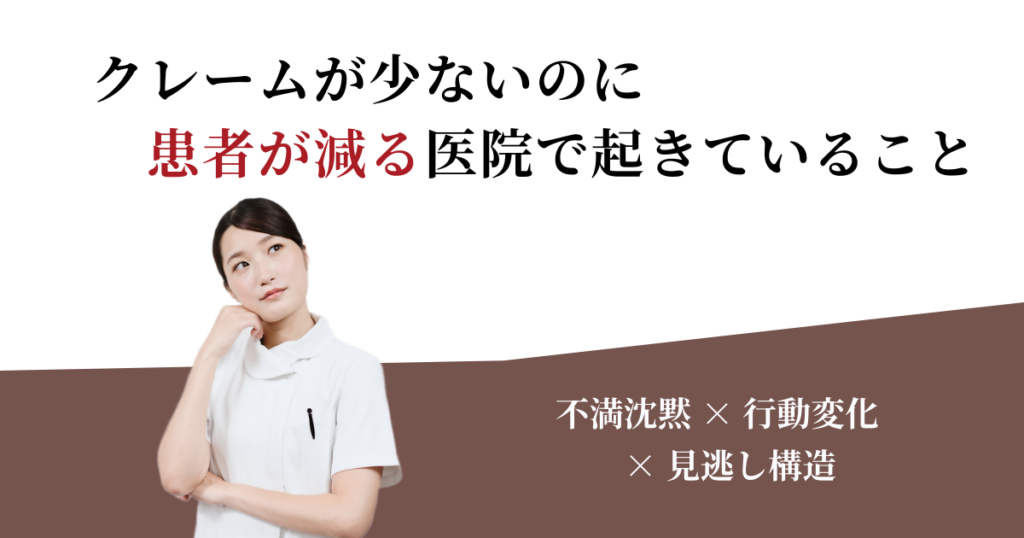 クレームはほとんどない。スタッフ対応についても大きな指摘はない。それでも患者数がじわじわ減っている――この状況に心当たりがある院長は少なくありません。 多くの医院では、「クレームが少ない=問題は起きていない」と判断しがちです。しかし実際には、クレームの有無と患者満足は必ずしも一致しません。患者は不満を感じても、それを言… -