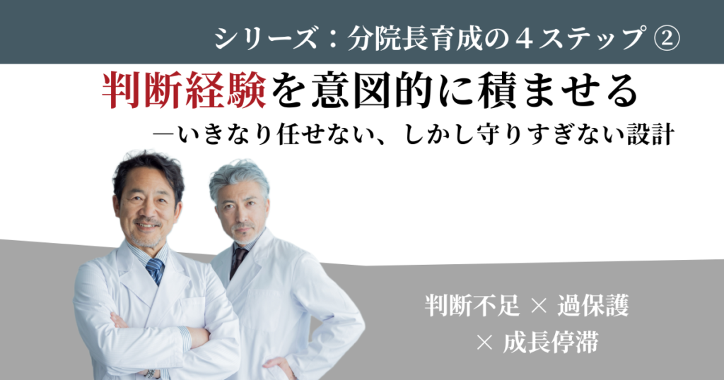 分院長を任せようとしたとき、多くの医院が二つの極端に分かれます。一つは「信頼しているから全部任せる」、もう一つは「不安だから細かく口を出す」。 どちらも、分院長育成という点では失敗に近づきます。分院長に必要なのは、結果ではなく判断経験です。判断の場を与えずに育つことはありませんし、失敗の余地を奪えば、責任感も主体性も… -