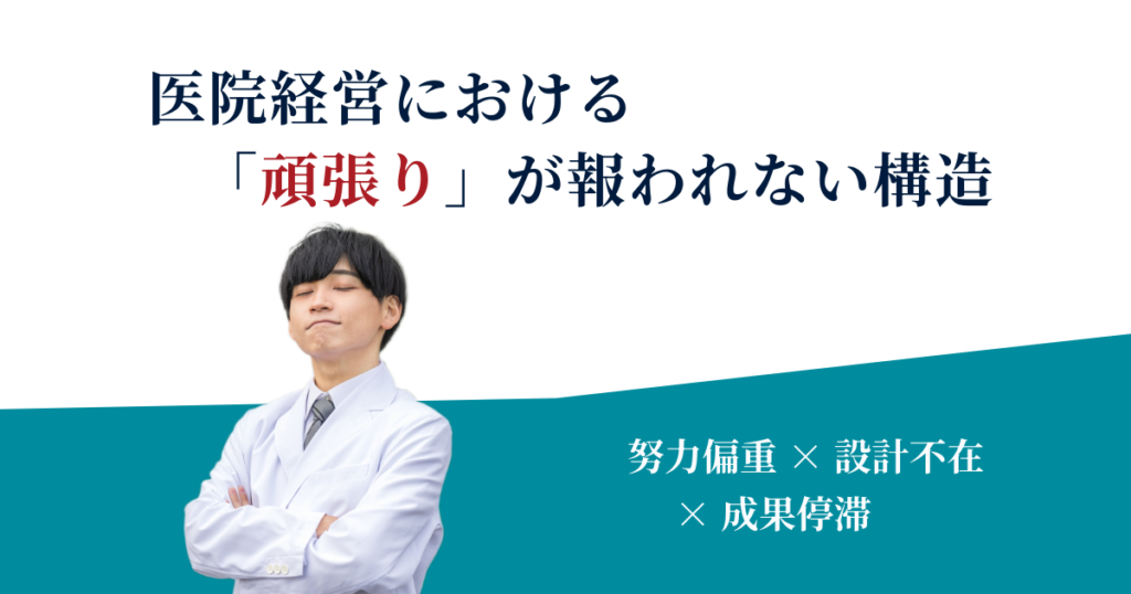 医院経営の現場では、「これだけ頑張っているのに成果が出ない」という声をよく耳にします。診療時間を延ばし、スタッフ対応に気を配り、トラブルにも向き合っている。それでも、売上や利益、組織の安定といった経営成果が思うように積み上がらない医院があります。 重要なのは、頑張っていないから成果が出ないのではないという点です。むし… -