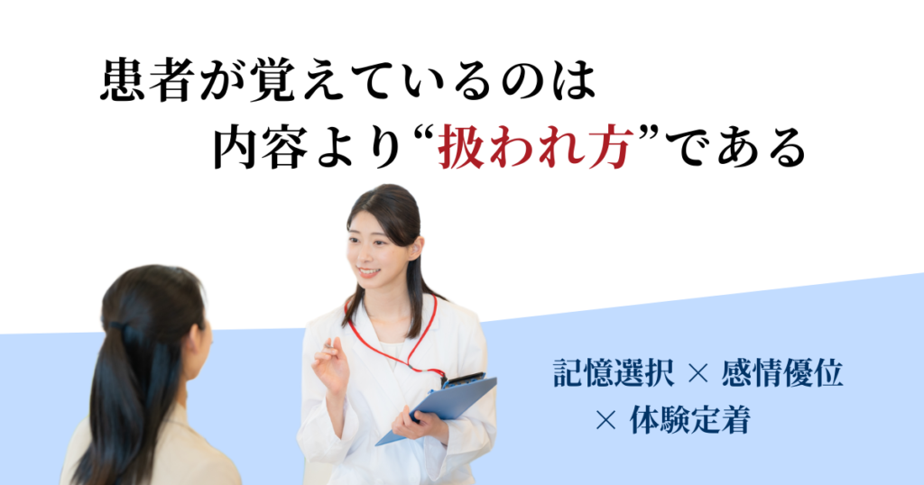 診療内容はきちんと説明した。必要な情報も伝えた。それでも患者さんの記憶に残っているのは、説明の中身ではなく、別の部分だった――このような場面に心当たりはないでしょうか。 多くの患者さんは、診療後しばらくすると説明された専門的な内容を細かく覚えていません。一方で、「どう扱われたか」「どんな気持ちになったか」は、意外なほど… -