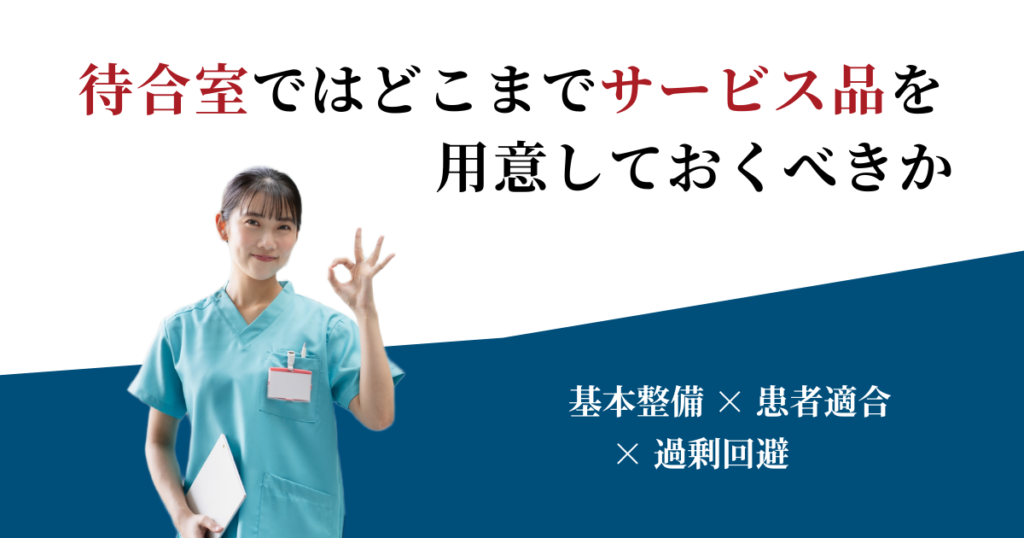 本記事は、待合室におけるサービス品の考え方を整理するものです。 多くの医院が、雑誌やウォーターサーバー、子ども向けのおもちゃなどを設置しています。しかし、「どこまで用意すればよいのか」「やりすぎではないか」と悩むケースも少なくありません。 結論から言えば、サービス品の目的は“豪華さ”ではなく“安心と配慮”です。待ち時間の… -
