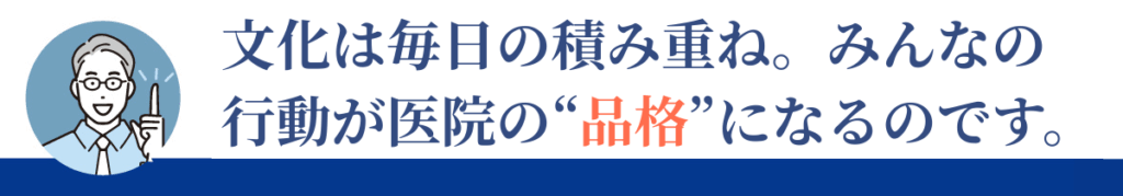 接遇を一時的に良くすることは難しくありません。しかし、続かない——これは多くの医院で起きる共通課題です。接遇を“習慣”ではなく、医院の“文化”として根づかせることができた組織は、患者さんからの評価だけでなく、スタッフの働きやすさや定着率も劇的に向上します。