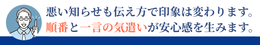 心理学的には、ネガティブな内容ほど“情報量を最小限にする”ことが、相手の負担を軽くする効果があります。淡々と丁寧に伝えることで、「感情ではなく事実として知らせてくれている」と認識され、信頼を損なうことなく説明ができます。