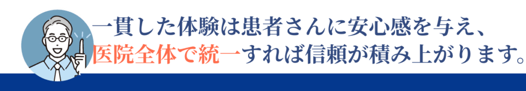 医院経営も同様で、診療の技術力だけに頼らず「どのスタッフが対応しても安心できる」という体験を提供することが重要です。挨拶や言葉遣い、清掃や内装など、小さな部分を標準化するだけでも医院の信頼性は大きく高まります。