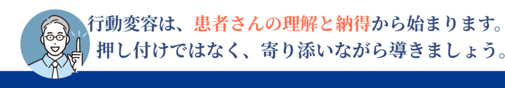 これらを一つひとつ丁寧に積み重ねることで、患者さんは自らの意思で行動を選び、習慣として定着させることができます。最終的には、患者さんの健康状態が向上し、医療者との信頼もさらに深まります。