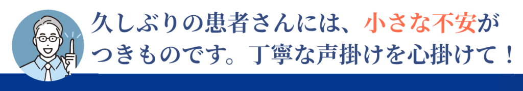 久しぶりの来院に対してネガティブな反応を見せず、「ここで良かった」と思える体験を積み重ねることが医院全体の信頼につながります。