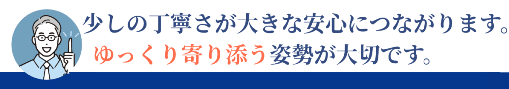 説明不足や急かすような態度は不安を増幅させますが、丁寧な声掛けやゆっくりとした案内だけで安心感は大きく変わります。