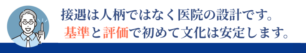 設計しても、評価と無関係であれば優先順位は上がりません。強い医院は接遇を制度に組み込んでいます。