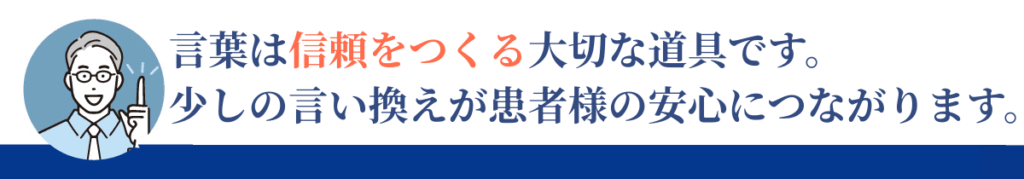 やさしい言葉で説明されると、患者様は理解度だけでなく「この人は自分に寄り添ってくれている」と感じ、信頼が深まります。