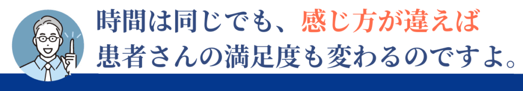 同じ15分でも、「長く感じる」場合と「意外とすぐだった」と思っていただける場合があります。違いを生むのは、時間そのものではなく“感じ方”。医院側の工夫しだいで、待ち時間は不満要因から好印象に変えることができます。