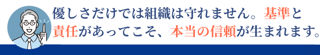 優しさは組織の潤滑油ですが、基準が伴わなければ甘さになります。甘さが続けば、やがて質が崩れます。