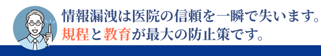 規程整備・送信チェック・アクセス制限・教育研修といった基本を「文化」として定着させることが必要です。経営者自身が率先して危機感を持ち、全スタッフと共有することで「守る医院の文化」が育ちます。最終的にそれが、患者からの信頼を積み重ね、医院の持続的な成長につながるのです。