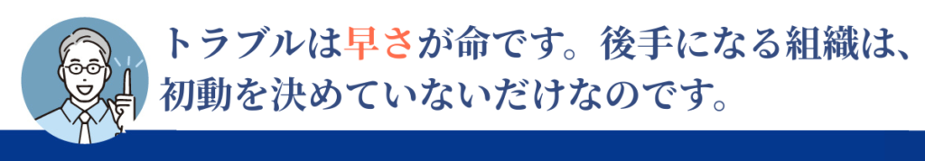 トラブル対応が後手になる組織に共通する欠陥は、初動対応が設計されていない点です。誰が気づき、誰に上げ、誰が判断するのか。この流れが決まっていない限り、対応は遅れ続けます。