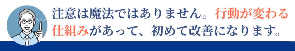 注意を増やすことが解決ではありません。行動が変わる回路をつくることです。注意が改善に変わる仕組みを持つことが、同じ問題を繰り返さない組織への唯一の道になります。
