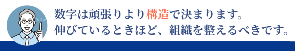 この設計があることで、数字が伸びても混乱が起きません。組織設計は、現状維持のためではなく、成長を止めないための投資です。ここを軽視すると、伸びた数字が一気に失速します。