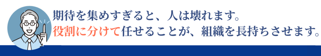 リーダーの頑張りに依存する組織は、再現性がありません。人が変われば崩れます。だからこそ、個人の努力ではなく、役割分担と仕組みで支える必要があります。