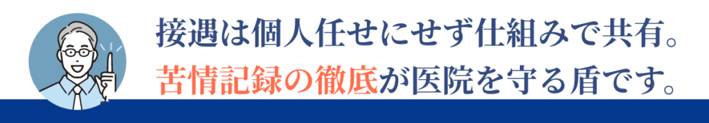 「接遇研修」「苦情対応マニュアル」「記録と共有」「リーダー関与」といった仕組みを整えることで、トラブルが裁判に発展するリスクを大幅に下げられます。これは単なる“サービス向上”ではなく、医院を守り信頼を高めるための戦略的な投資です。