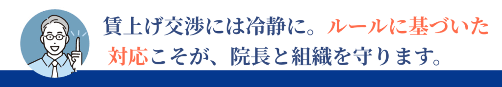 集団での交渉は、実際の金額よりも「院長がどう対応するか」がスタッフ全体の信頼に直結します。そのため、感情ではなく「ルール」に基づいた対応が不可欠です。