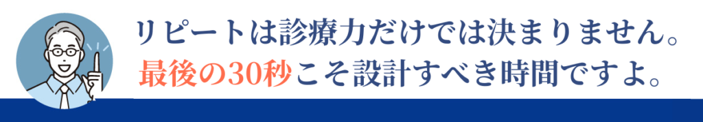 本記事は、患者さんが「また来よう」と無意識に判断する“最後の30秒”に焦点を当て、その設計方法を整理するものです。