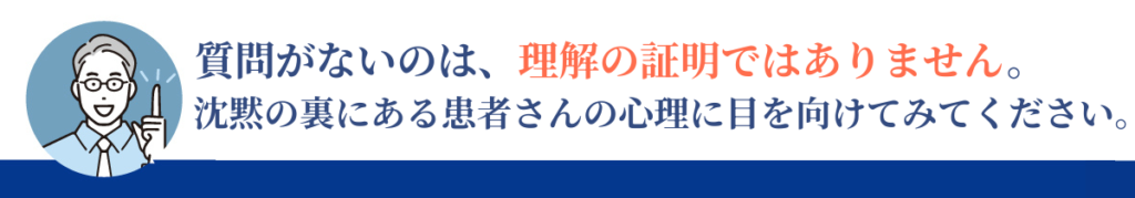 患者さんが質問しない理由は、理解できているからとは限りません。実際には、理解が浅いからこそ質問できないケースも多く存在します。