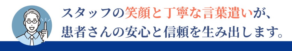 「スタッフが親切だから通いやすい」と思われれば再来院につながり、家族や友人の紹介も期待できます。