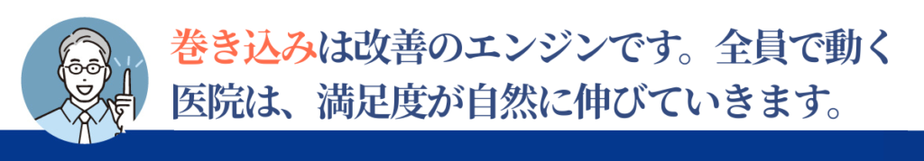 スタッフを巻き込むことは、満足度改善を加速させる最も強力な方法です。院長が一人で抱えるのではなく、全員で改善に取り組むことで、精度・スピード・定着率のすべてが向上します。