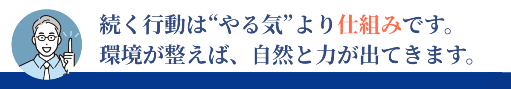 行動が自然に起きるように環境を整えることこそ、モチベーションを安定させる最も確実なアプローチです。