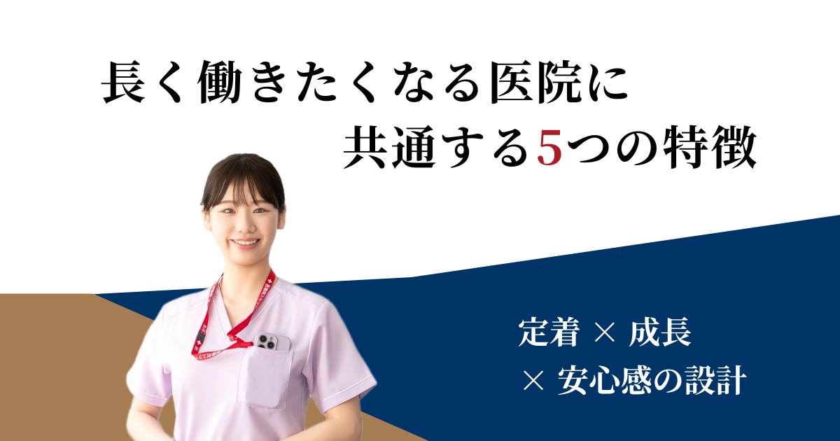 長く働きたくなる医院には、安心して相談でき、成長を実感でき、人間関係のストレスが少なく、評価に納得できる環境があります。これらは特別な制度ではなく、日々の仕組みと関わり方の積み重ねによってつくられます。