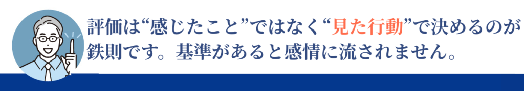 人はどうしても印象に影響されやすく、評価には感情が混ざりがちです。公平な評価を実現するためには、「感じたこと」を採点材料にするのではなく、「実際に見た行動」に視点を戻す必要があります。行動に基づく評価は、誰が見ても同じ判断ができ、評価の透明性が高まります。