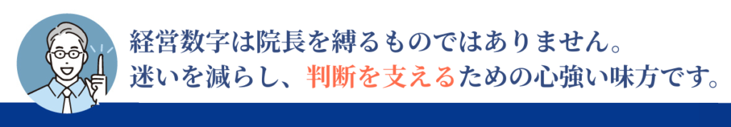 経営数字は、院長を縛るものではありません。現実を把握し、判断を支え、迷いを減らすための道具です。数字と向き合うことは、経営を厳しくする行為ではなく、経営を安定させる行為だと言えます。