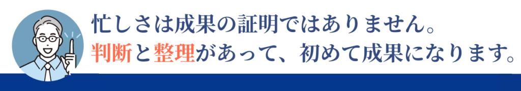 対応は忙しさを生みますが、成果を生むのは判断です。対応に追われ続けている限り、構造は変わらず、忙しさだけが残ります。