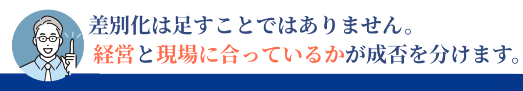 差別化は本来、業務を整理し、強みを明確にするためのものです。それが逆に業務を複雑にしているなら、経営として破綻しています。現場が回らない差別化は、長く続きません。