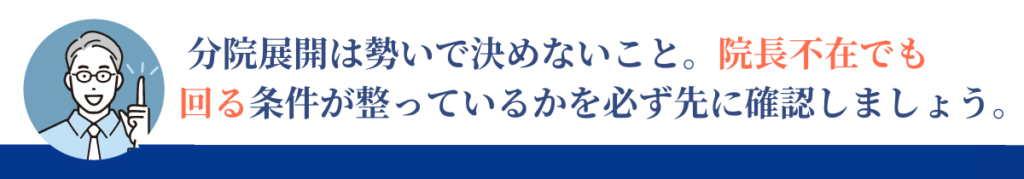 分院展開は、院長の分身を作ることではありません。院長がいなくても機能する仕組みが、本院に存在しているかが最初の条件です。