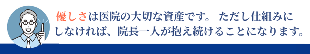 一方、それが仕組み化されていない医院では、優しさがすべて院長個人に集中します。