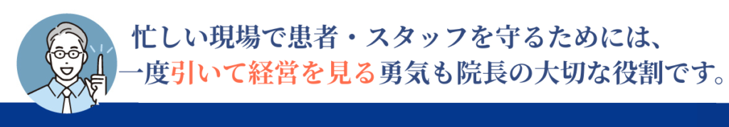 診療や現場対応に深く関与すること自体は悪いことではありません。しかし、現場の忙しさによって、重要な判断を「後で考える」「とりあえず様子を見る」が増えてきた場合、それは切り替えのサインです。