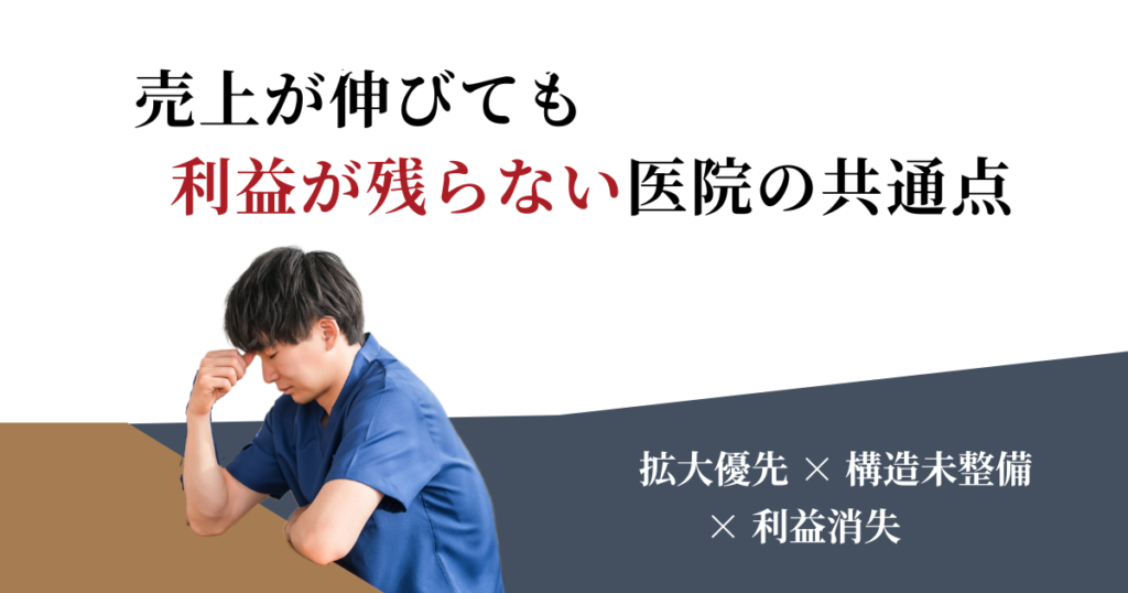 売上は年々伸びているのに、なぜか手元に利益が残らない。 この悩みを抱える医院は少なくありません。患者数は増え、稼働率も高い。それにもかかわらず、資金繰りや将来への不安が消えない状態が続くと、「経営は順調なはずなのに何かがおかしい」と違和感を覚えるようになります。 本記事は、売上が伸びているにもかかわらず利益が残らない… -